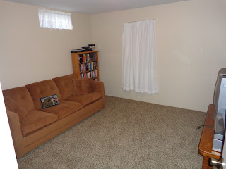 I finally got around to taking some pictures of our new and improved basement. The rooms were surprisingly hard to photograph. Everything looks boring and small and cluttered. But trust me, it is a million times nicer then it was before. I forgot to take before pictures, because I have no brain. Basically, the walls, carpet, and ceiling were a mess. Now everything is fixed and painted and new.